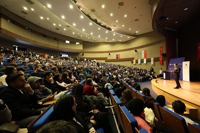 “Türkiye Yüzyılı’nda Ulaştırma Vizyonu” başlıklı konuşmasını yapmak üzere kürsüye davet edilen Ulaştırma ve Altyapı Bakanlığı Bakan Yardımcısı Osman Boyraz, en güzel zaman diliminin gençlerle geçirilen zamanlar olduğunu belirterek öğrencilerle bir arada olmaktan duyduğu memnuniyeti dile getirdi.