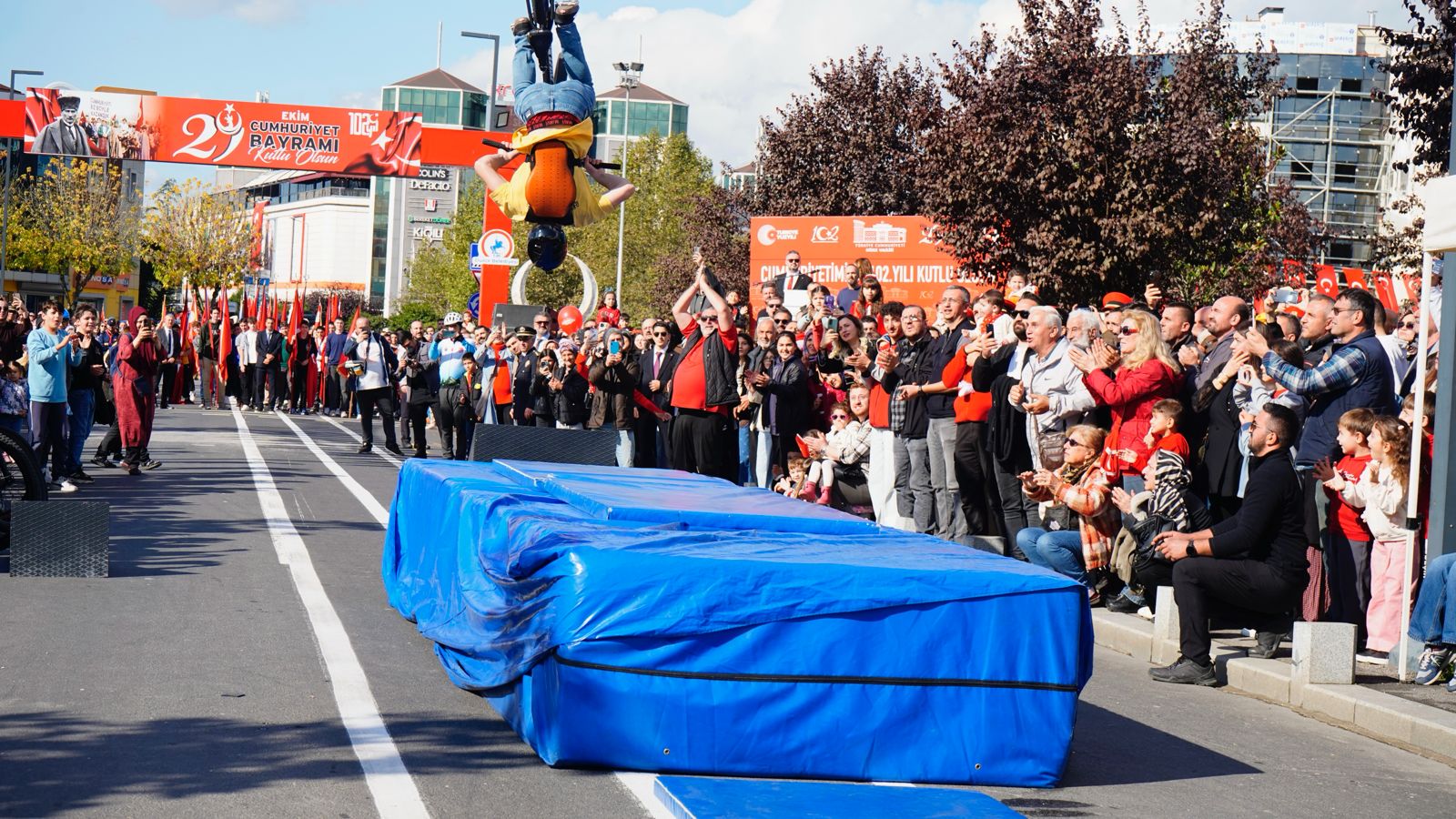 Düzce Bisiklet Kulübü üyeleri, yaptıkları akrobatik bisiklet gösterileriyle törene renk kattı. Ortaokul ve lise öğrencilerinin geçişinin ardından emniyet, jandarma, itfaiye, AFAD ve sivil toplum kuruluşlarına ait araçlar sirenler eşliğinde kortej yaptı.