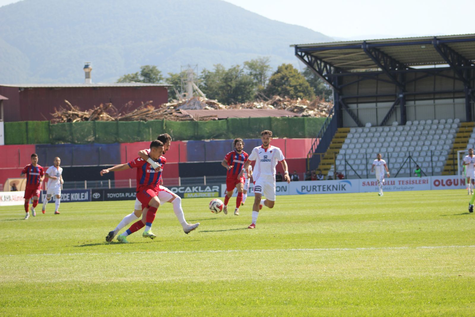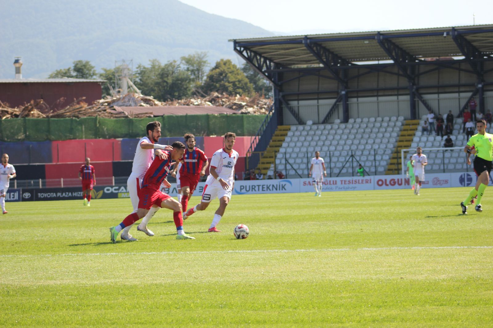 dak:14.Düzce Cam Düzcespor hazırlık paslarıyla rakip alana geçmeye calışırken rakip futbolcu Berkcan Cengiz araya girerek sahip olduğu topla Düzce Cam Düzcespor kalecisi Mustafa Erdem Uysal ile karşı kaldığı pozisyonda topu ağlarla buluşturarak takımını 0-1 öne geçirdi.