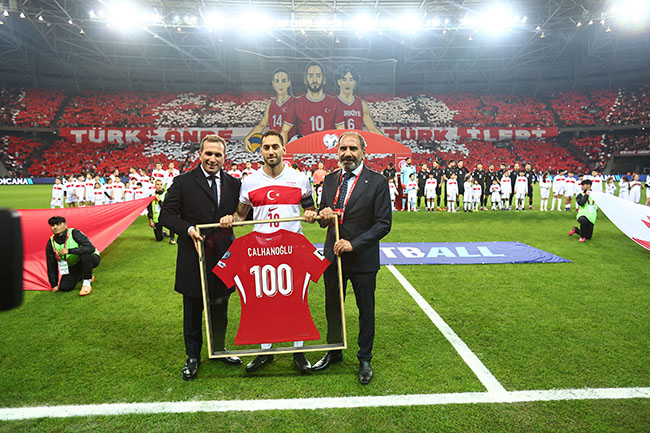 Bulgaristan maçında A Millî Takım formasını 100. kez giyen Kaptan Hakan Çalhanoğlu'na Gürcistan karşılaşması öncesinde 100 numaralı özel forma ve plaket verildi. TFF 1. Başkan Vekili Mecnun Otyakmaz ve Genel Sekreter Abdullah Ayaz, Hakan Çalhanoğlu'na günün anısına hazırlanan formasını ve plaketini takdim etti. Hakan Çalhanoğlu, Gürcistan maçıyla birlikte 101. kez A Millî Takım formasını giyerek, en fazla millî formayı giyen oyuncular sıralamasında 4. sırada yer alan Emre Belözoğlu'nu yakaladı.