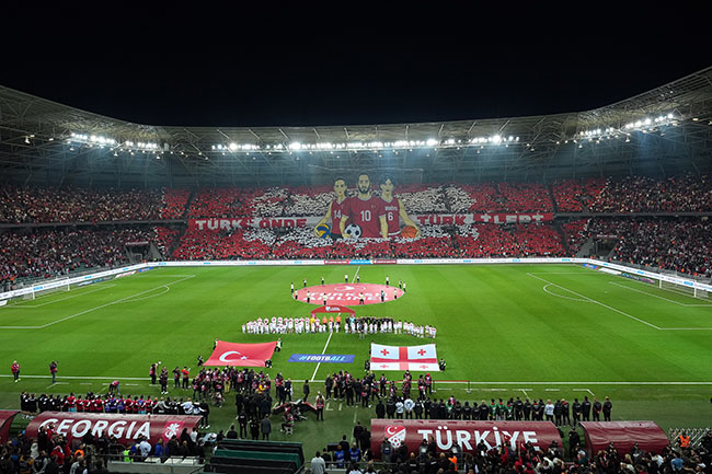Türkiye ile Gürcistan arasında oynanan mücadele öncesinde Kocaeli Stadı tribünlerinde özel bir koreografi gerçekleştirildi. Koreografide kırmızı-beyaz renklerdeki Türkiye haritası üzerinde Kadın A Millî Voleybol Takımı Kaptanı Eda Erdem, Erkek A Millî Futbol Takımı Kaptanı Hakan Çalhanoğlu ve Erkek A Millî Basketbol Takımı Kaptanı Cedi Osman'ın görselleri sahnelendi. Görsellerin yanlarındaki pankartta da "Türk önde Türk ileri" yazısı yer aldı.